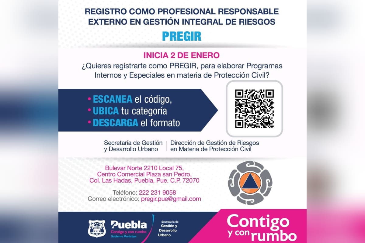 Con la finalidad de que las obras en proceso constructivo sean lugares más seguros en beneficio de la población en general, el Ayuntamiento de Puebla que encabeza Eduardo Rivera Pérez, a través de la Secretaría de Gestión y Desarrollo Urbano, da inicio al registro de los Profesionales Responsables Externos en Gestión Integral de Riesgos (PREGIR), anteriormente conocidos, como Asesores(as) y/o Capacitadores(as) Externos(as) En Materia de Protección Civil en el Municipio de Puebla.