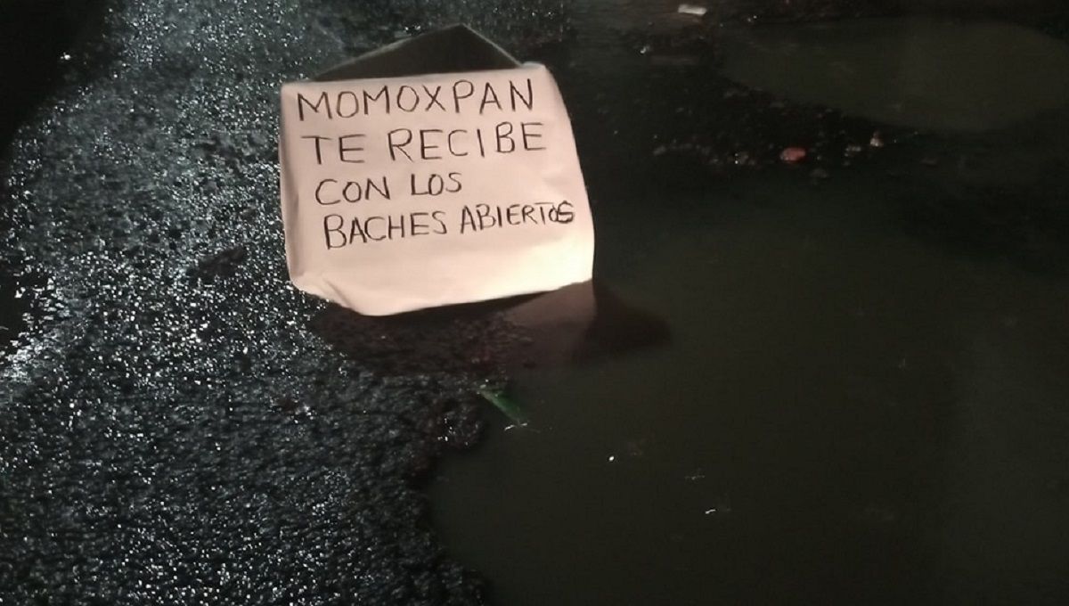 «Momoxpan te recibe con los baches abiertos»: vecinos colocan letreros en hoyos